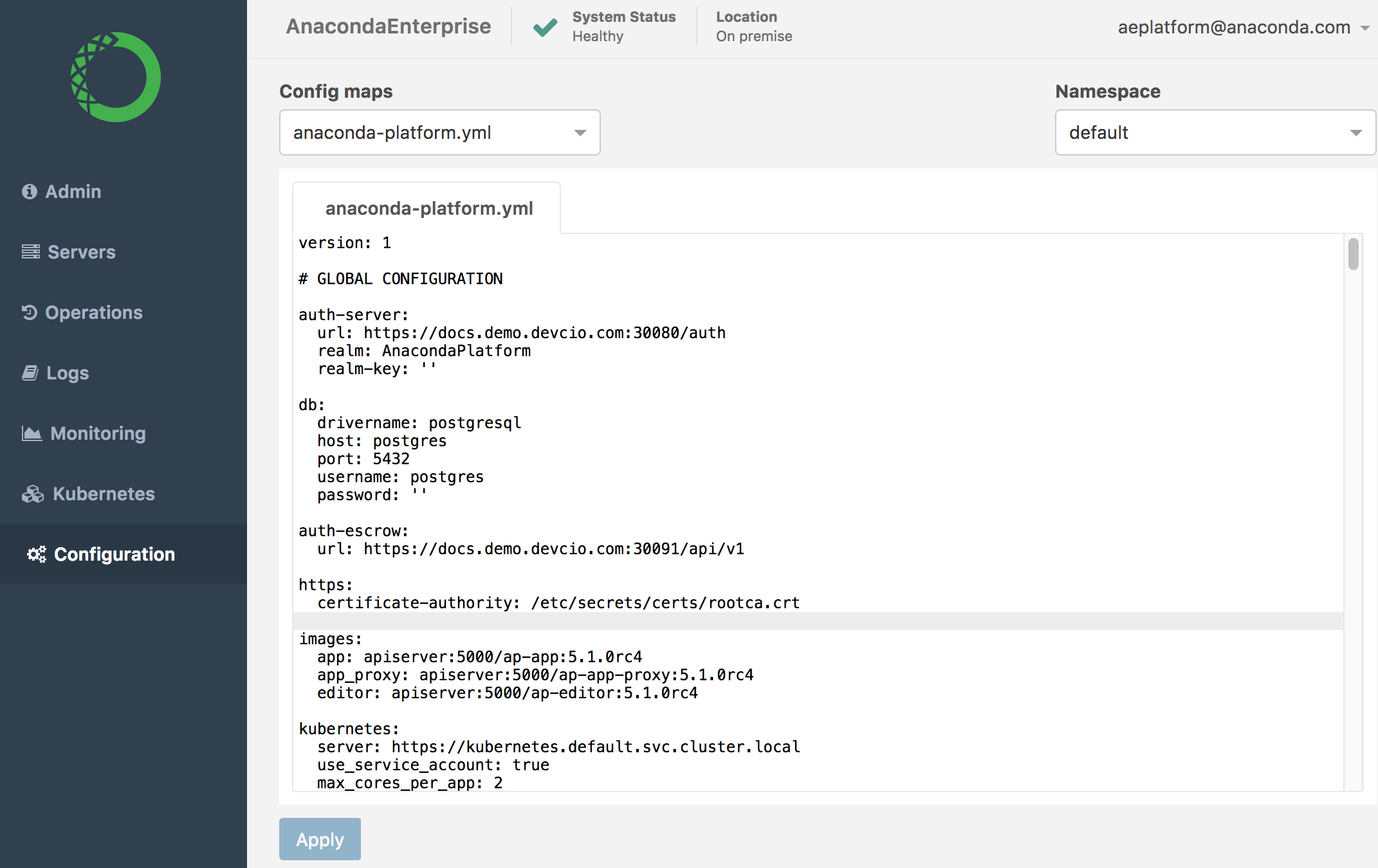 - Open the Anaconda Enterprise Operations Center and navigate to the platform configuration page.