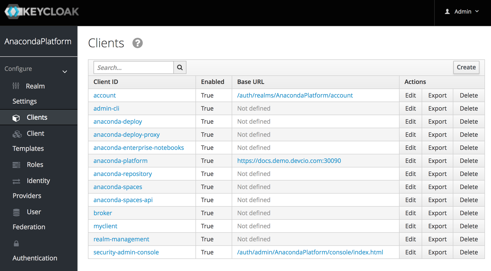AnacondaPlatformrealm, then in the left menu, click on the Clients configuration tab.Replace all URLs in the following client settings with the FQDN of the Anaconda Enterprise server: