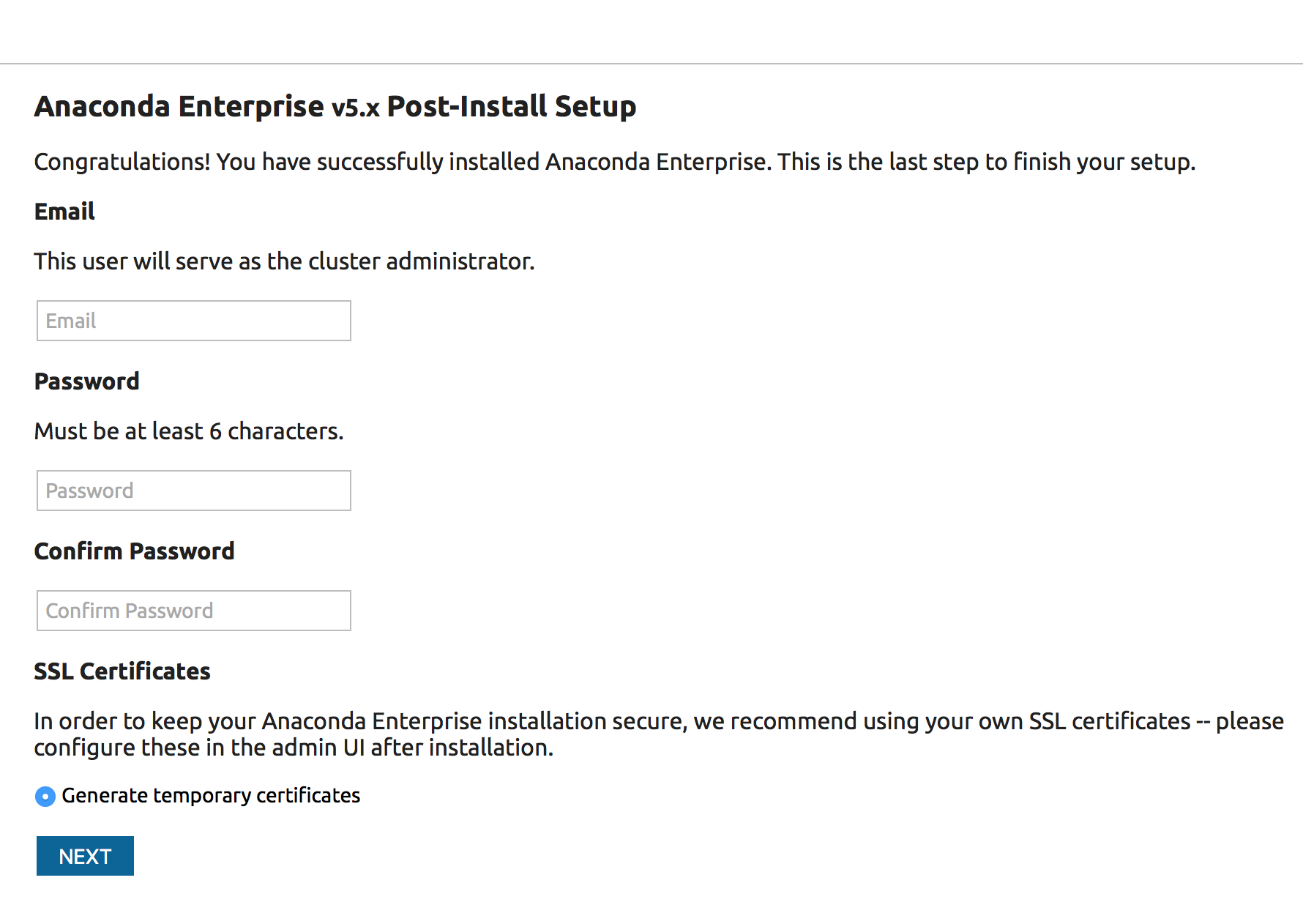 The following configuration steps should be performed after a successful new installation of Anaconda Enterprise.
