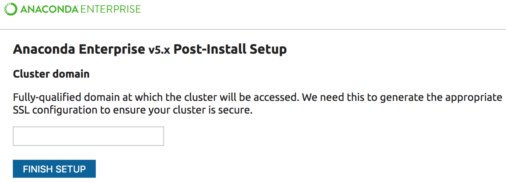This installation path will generate self-signed SSL certificates that can be changed later in the Admin page of Anaconda Enterprise. Enter the fully-qualified domain at which the cluster will be accessed and click the Finish setup button.