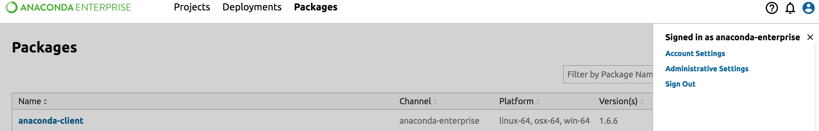 In the top-right corner of the Anaconda Enterprise screen, click the user icon.