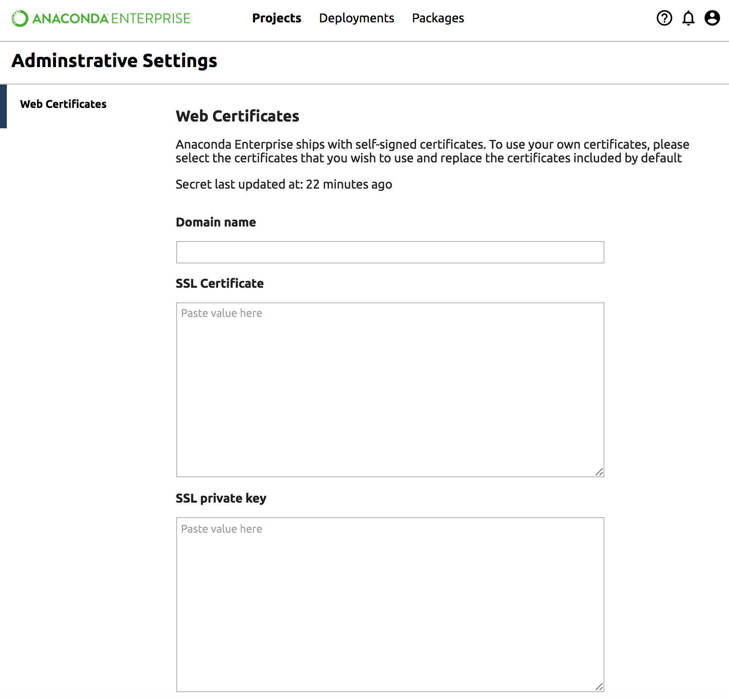 After initial configuration, configuring SSL certificates for Anaconda Enterprise is done from the Anaconda Enterprise Administrative Settings menu.
