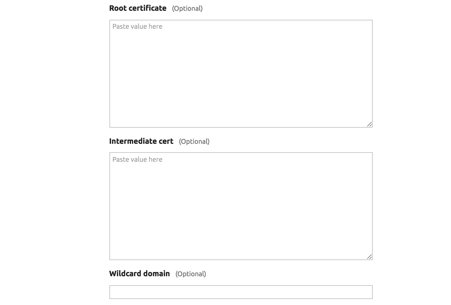 rootca.crt. A root certificate is optional but recommended.- SSL intermediate chain/bundle, filename