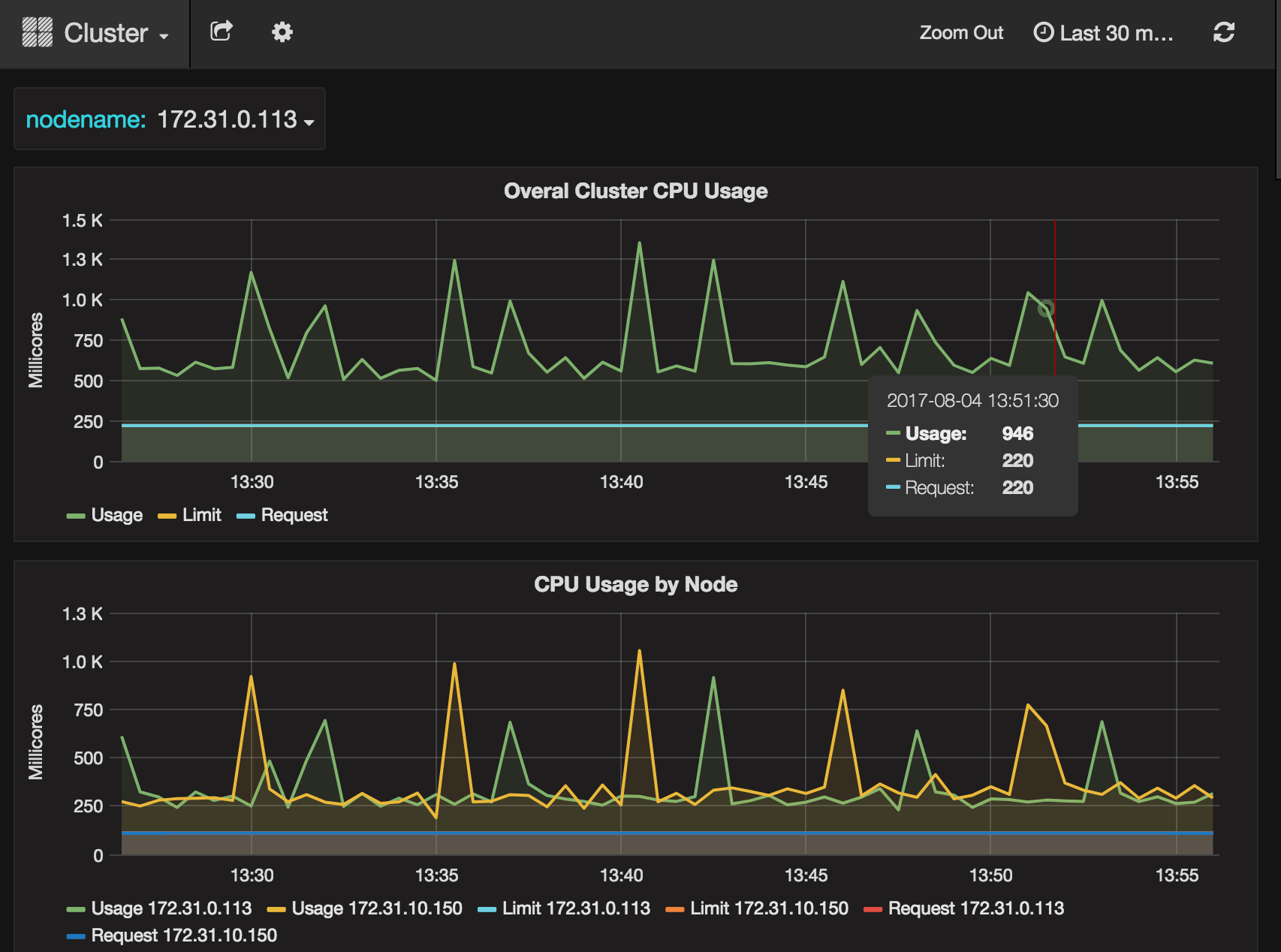 Select the cluster, pod and/or node you want to monitor by clicking the “Cluster” link at the top of the page, then from the drop-down menu that appears select the cluster or Pod. You can then optionally select a specific nodename to monitor.