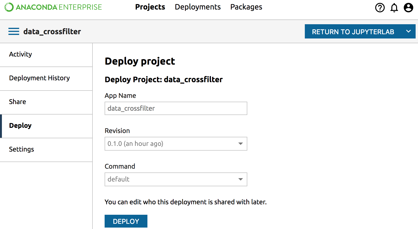 After deploying a project, you are ready to interact with your Deployment. The following example is a Bokeh app for data clustering.