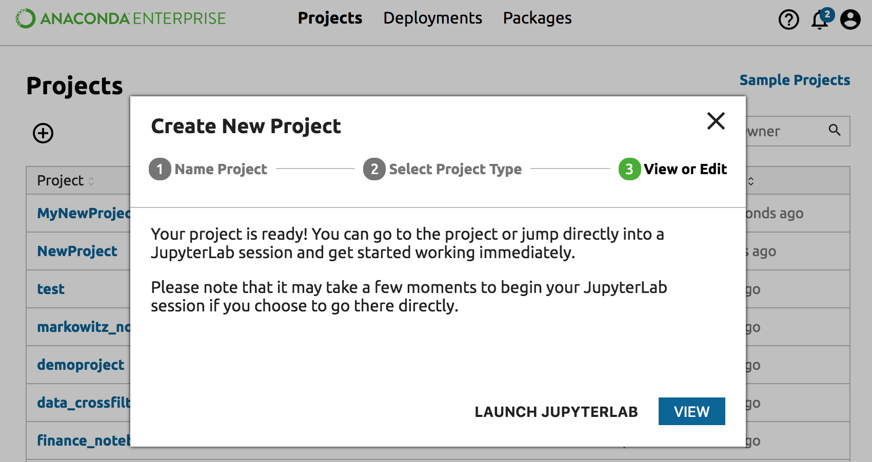 If the dialog is still open, click the Launch JupyterLab link to work with the project in JupyterLab. If the dialog is closed you can click on your new project in the Project page and access actions from the Project Detail page.