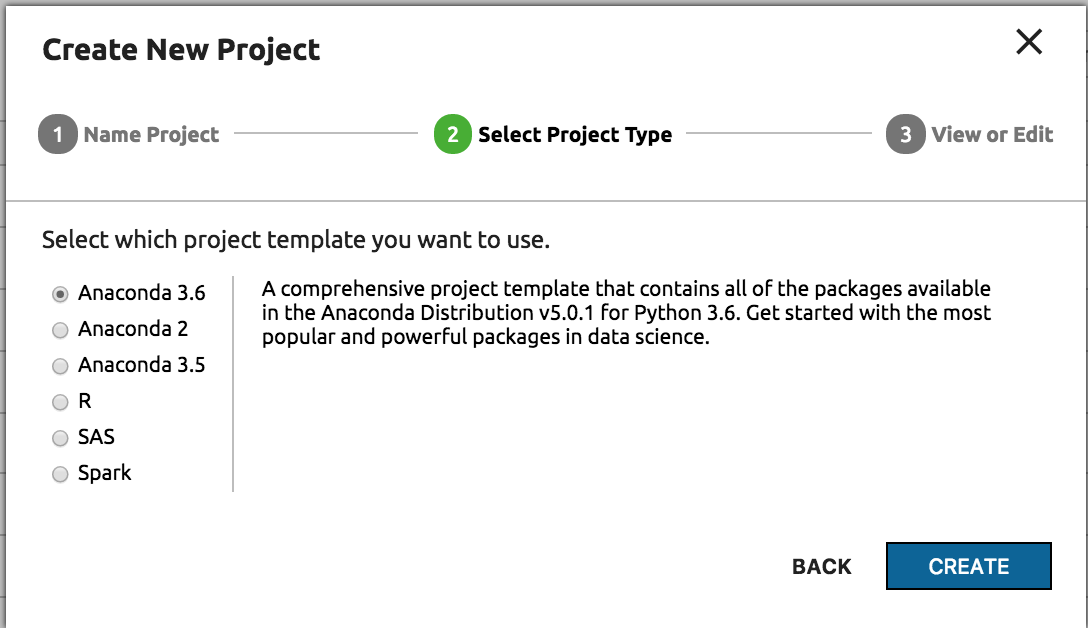 Select the project type, whether Anaconda with Python 3.6, Anaconda with Python 2.7, Anaconda with Python 3.5, R language, SAS or Spark.