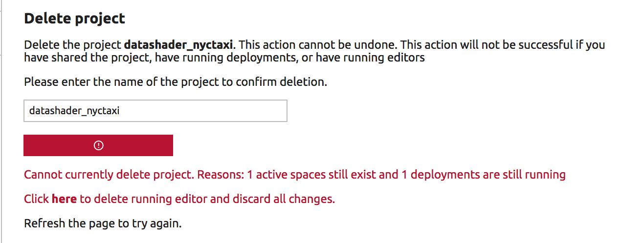 In the Delete project section of the page, type or paste the name of the project in the confirmation box. When the name is typed correctly the gray Delete Project button turns red.
