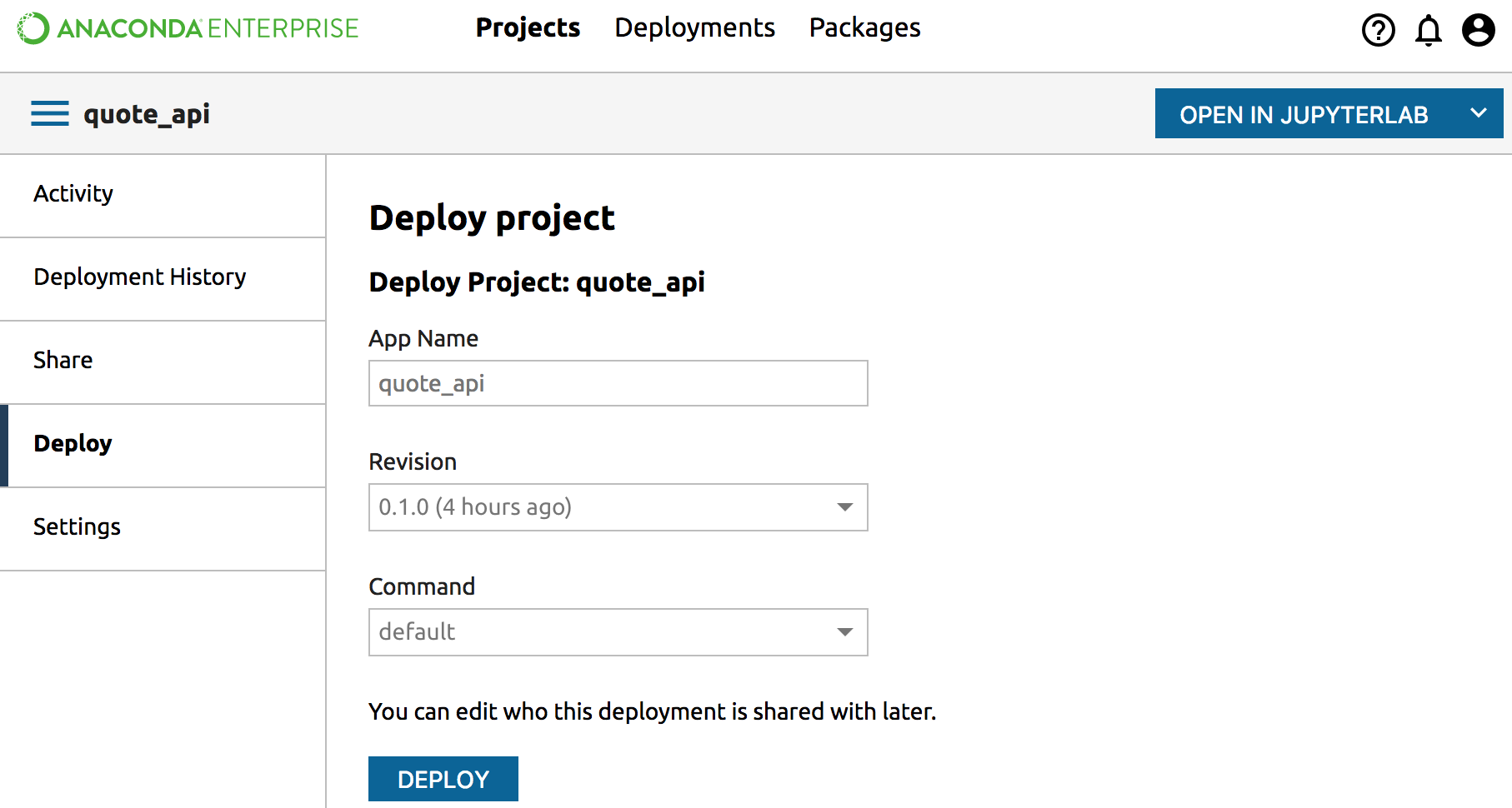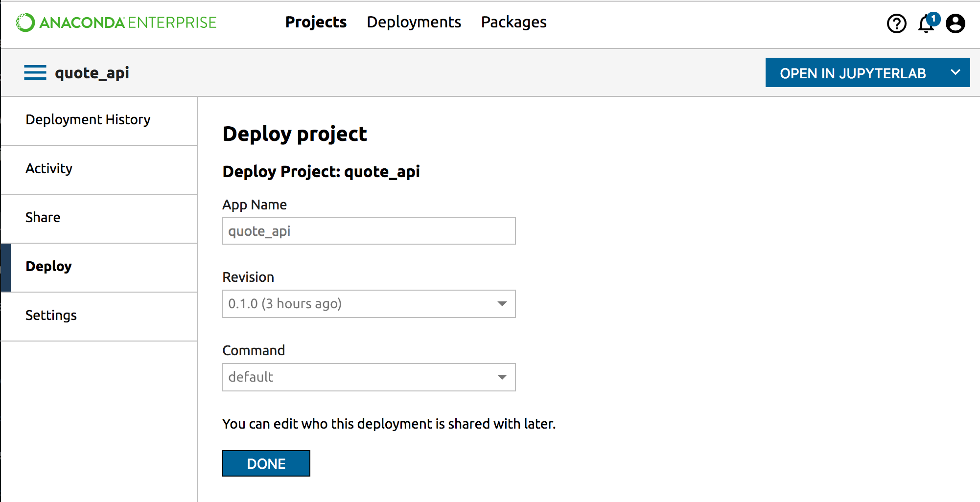 - Created an Anaconda Project, added a deployment command and committed a deployable revision.