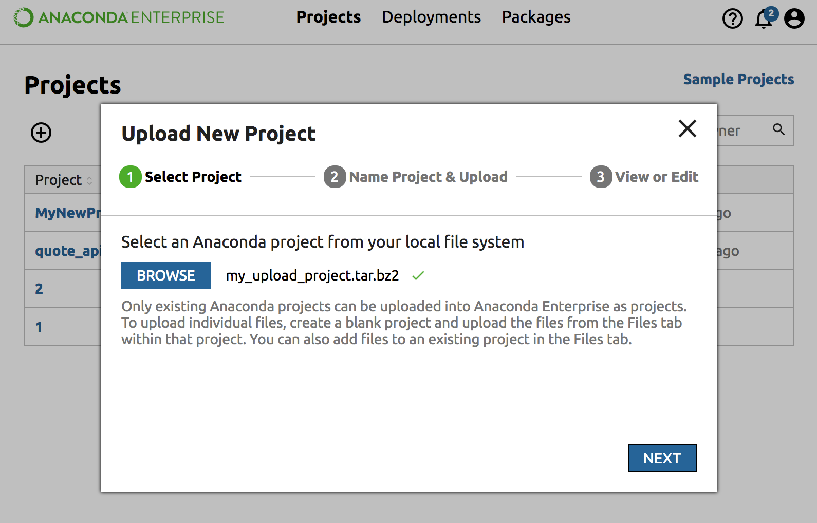 Click the Browse button and select a compressed (tar.bz2, tar.gz or zip) Anaconda Project from your local file system. Click Next.