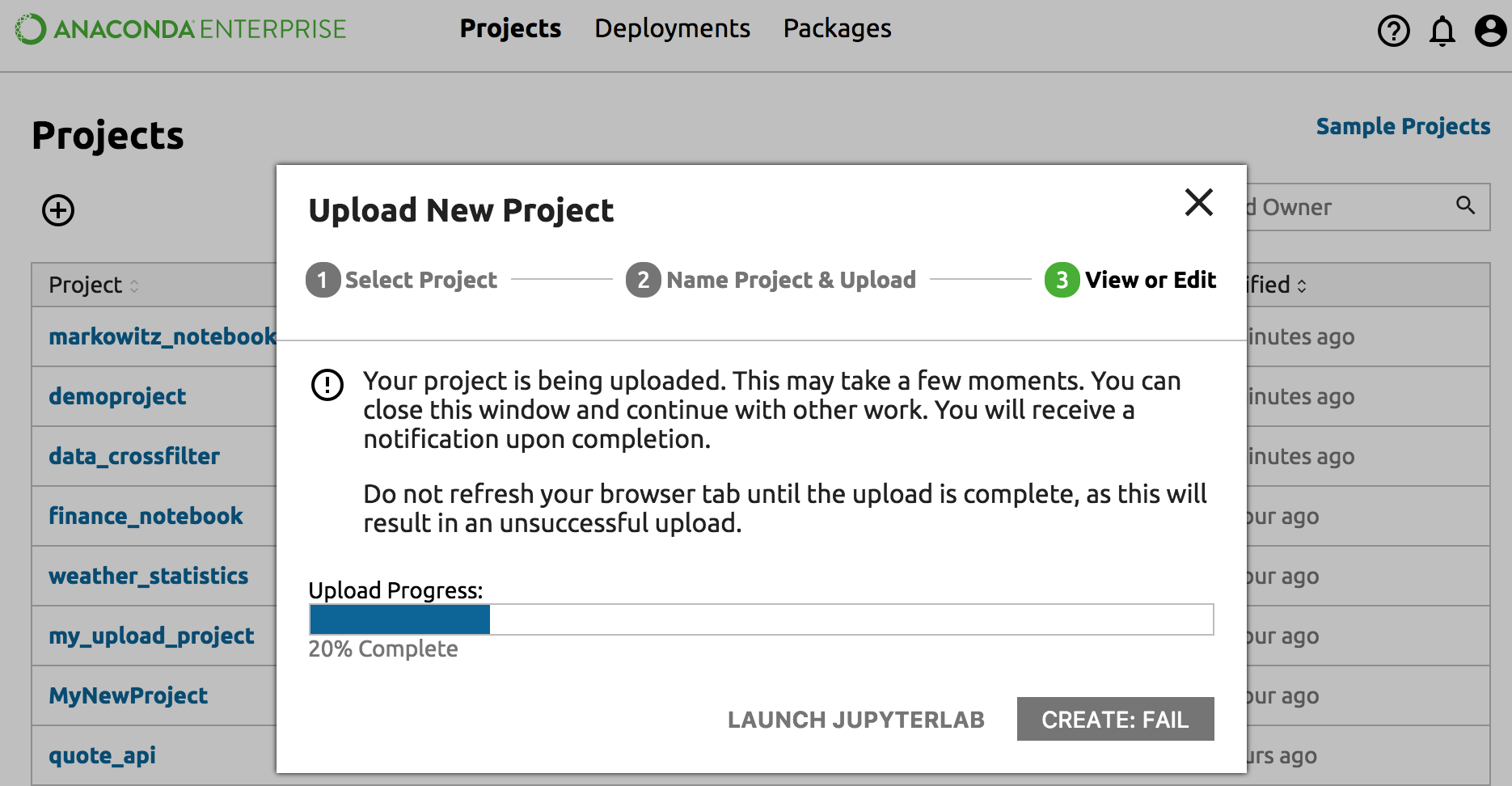 Only existing Anaconda Projects can be uploaded to Anaconda Enterprise. You may have downloaded a project from another source or a colleague, or created a project using an editor on your computer. To learn more about creating a project, refer to the tutorial Creating Project.