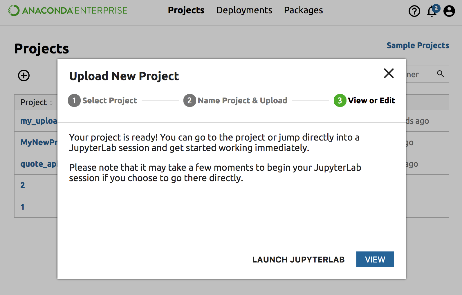 If the dialog box is still open, click “Launch JupyterLab” to work with the project in JupyterLab. If the dialog is closed you can click on your new project in the Project page and access actions from the Project Detail page.