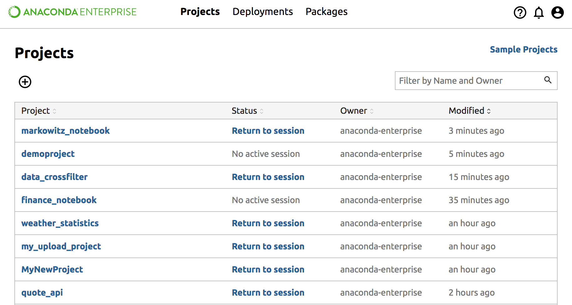 - Click the Add(+) button at the top left to Create or Upload an Anaconda Project.