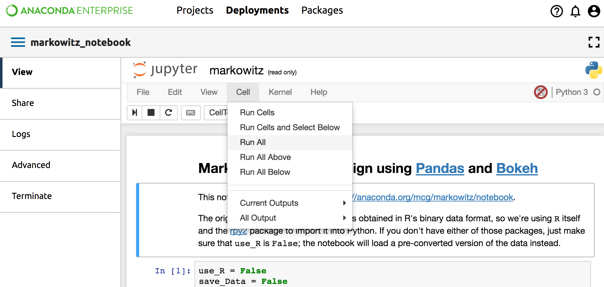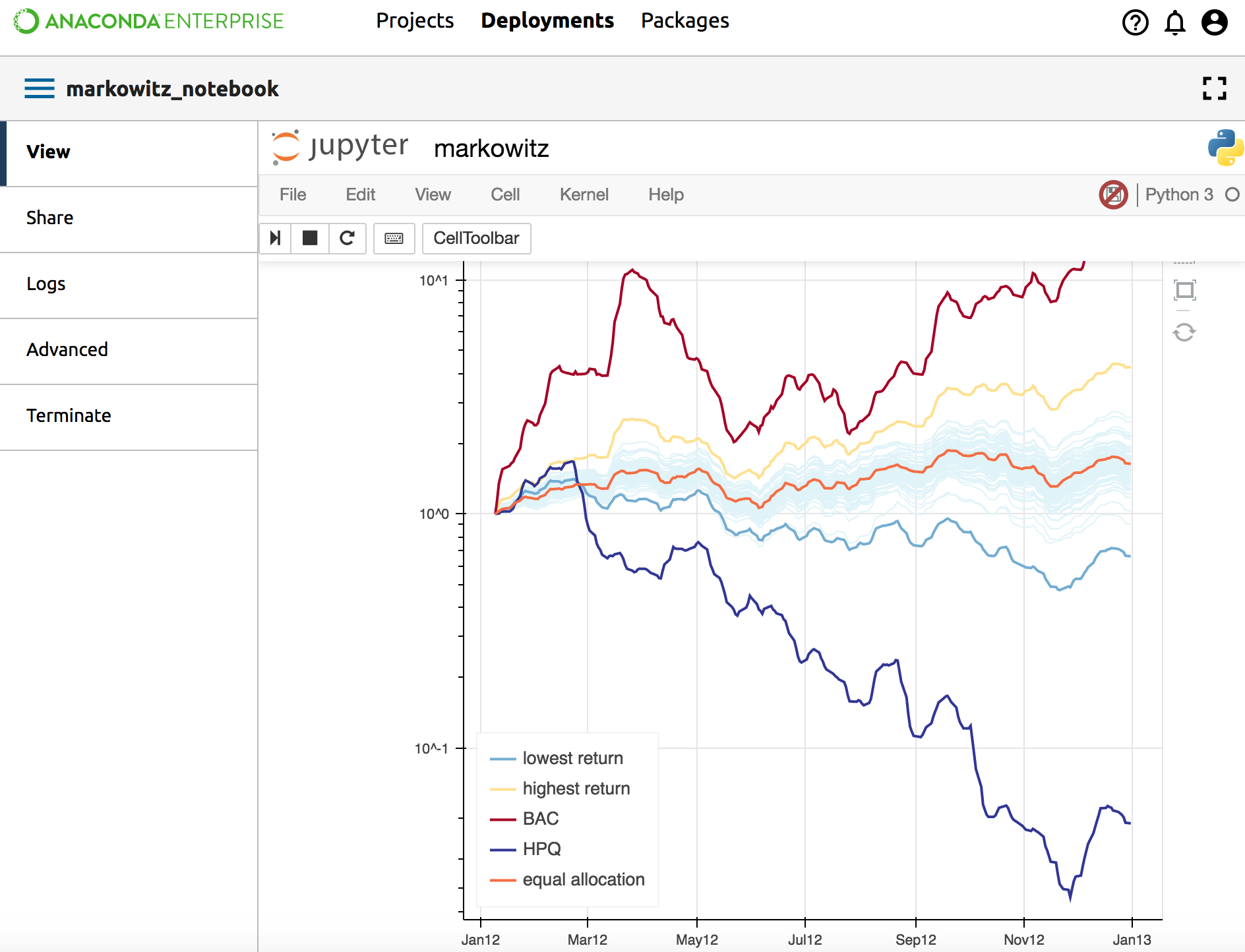 This tutorial uses the sample project, Markowitz Notebook, included with Anaconda Enterprise. This project is an investment portfolio analysis that demonstrates a Jupyter Notebook running both R language and Python.