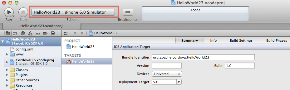 創建後,您可以在 Xcode 內打開它從。按兩下打開 hello/platforms/ios/hello.xcodeproj