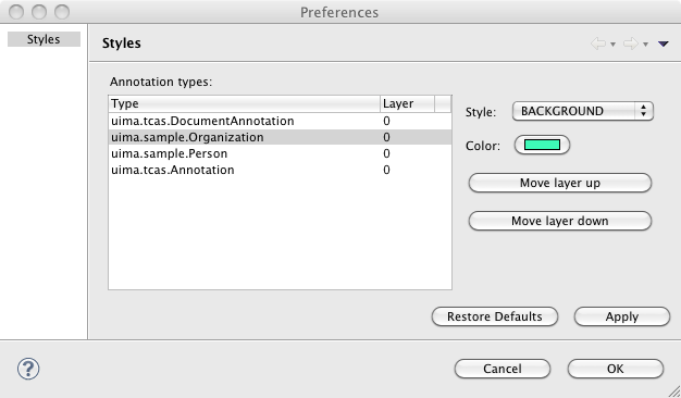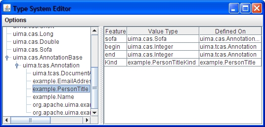 Before discussing this page in detail, it is important to note that there are 3 settings that affect the operation of this page. These are accessed by selecting the UIMA → Settings (or by going to the Eclipse Window → Preferences → UIMA Preferences) and checking or unchecking one of the following: “Auto generate .java files when defining types”, “Generate JCasGen classes only for types defined within the local project scope” and “Display fully qualified type names.”