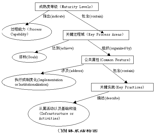 对每一级别,CMM(V1.1)分别定义了2—7个关键过程域(KPA,Key Process Area)。一个软件机构,如果要达到某一个特定的级别,就必须关注这些域。每一个KPA都涉及到一些目标,它们代表通过这个KPA的过程来达到的要求。不同成熟度级别的KPA都可以用来对现存的软件过程的能力进行评估,以及识别那些为了将过程从低成熟度发展到更高的成熟度需要加强的地方。第一级实际上是一个起点,任何准备按CMM进化的企业一般都处于这个起点上,并通过这个起点向第二级迈进。除第一级外,每一级都设定了一组目标,如果达到了这组目标,则表明达到了这个成熟级别,可以向下一个级别迈进。CMM系不主张跨越级别的进化,因为从第二级起,每一个低级别的实现均是高级别实现的基础。