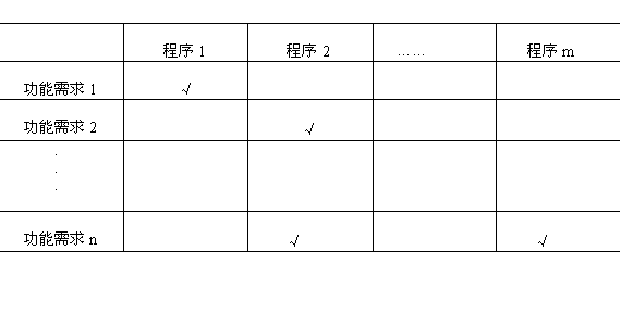 说明为了系统维护的方便而在程序内部设计中作出的安排,包括在程序中专门安排用于系统的检查与维护的检测点和专用模块。 各个程序之间的对应关系,可采用如下的矩阵图的形式;