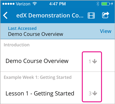 This example lists subsections in a course and shows how many videos will download when you select the icon.