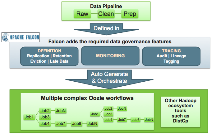 Each entity is defined separately and then linked together to form a data pipeline. Falcon provides predefined policies for data replication, retention, late data handling, and replication. These sample policies are easily customized to suit your needs.
