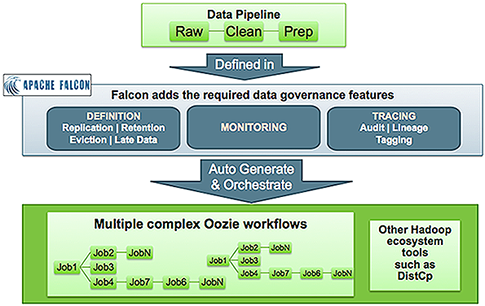 Falcon helps to address data governance challenges that can result when a data processing system employs hundreds to thousands of data sets and process definitions, using high- level, reusable "entities" that can be defined once and reused many times. These entities include data management policies that are manifested as Oozie workflows.