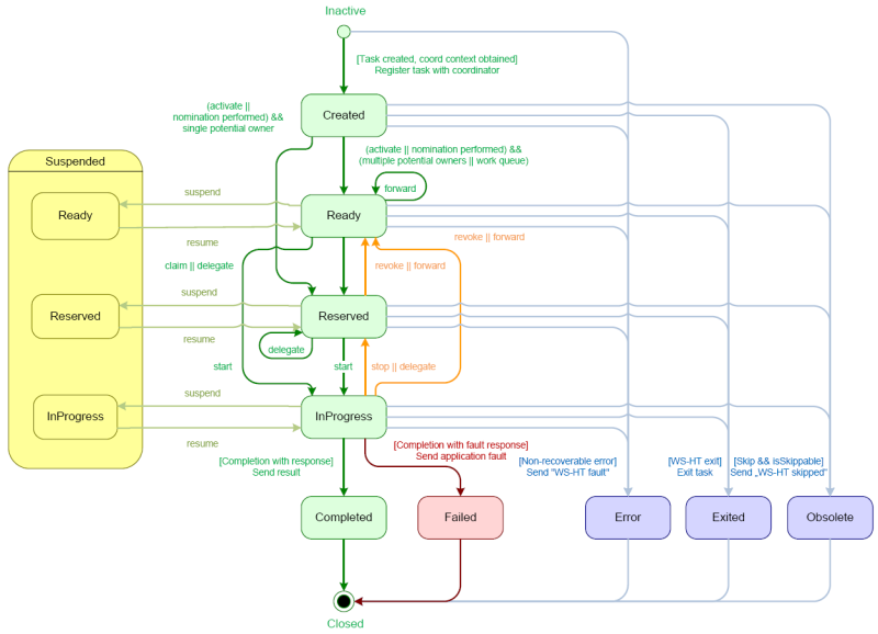 The human task itself usually has a complete life cycle itself as well. For details beyond what is described below, please check out the WS-HumanTask specification. The following diagram is from the WS-HumanTask specification and describes the human task life cycle.