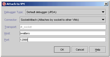 Once you startup JBoss then you can attach to it from NetBeans to do your debugging. Select the Debug -> Attach menu selection in NetBeans and then the debugger type should be default debugger JPDA. Select the SocketAttach in the connector dropdown and then enter the port number you selected when you edited the debug.bat/debug.sh file. The hostname should default to your local hostname when you select SocketAttach. After you complete filling in the debug "Attach to VM" dialog it should look something like: