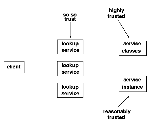 Granting all permissions to everyone is a very trusting act, in the potentially hostile world of the Internet. Not everyone is "mister nice guy". The client is vulnerable to attack because it is downloading code that satisfies a request for a service, and then executing that code. Without security checks, the client can download code from a hostile service. While the code has to implement the requested interface, and maybe satisfy conditions on associated Entry objects, without security it is otherwise unconstrained as to what it does.