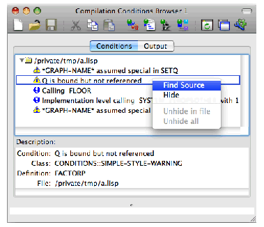 (backquote) can be used to find the source of the next condition shown in the browser.The description area in the Conditions view of the Compilation Conditions Browser shows a description of any item selected in the conditions area. The description contains details of the selection condition. The following information is shown: