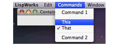 The menu items This and That are radio buttons, only one of which may be selected at a time. The other menu items are just ordinary commands, as you saw in the previous examples. Note that the CAPI automatically groups the items which are parts of a menu component so that they are separated from other items in the menu.