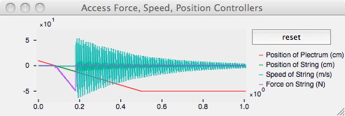 The image at the top of this page shows force, position and speed controllers obtained from the plucked access on the string and a position controller from the plucking access on the plectrum as given in the Modalys plucked string example.