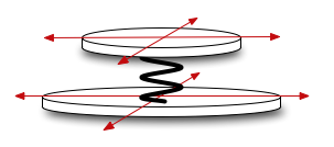 A simple bi-directional two-mass model that can serve as a hammer, plectrum, finger, etc. Generally the two-mass model has a small mass and a large mass; the small one will be "connected" to the object being excited, and the large one will be manipulated by the user. The two masses are connected by a spring. Visualize a large coin on a table, with a small coin on top, and a spring between them. The large coin can be moved in two directions ('trans0 and 'trans1), and the spring will cause the small coin to follow.