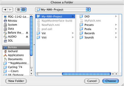 Créer un modulePour créer un module NMI, utilisez les menus « Objects » de la fenêtre principale. Les modules sont classés par types : source sonore, effets, effets spectraux, objets de contrôle, objets d’analyses. ![]() Menu Objets Sélectionnez par exemple le module « Sound » dans le menu vert. Une nouvelle boite apparaît en haut, à gauche du patch. Si vous n’avez pas sélectionné un dossier projet auparavant, un sélecteur de fichier s’ouvre pour vous demander d’en choisir un. ![]() Attention !