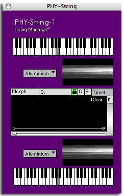 Module Corde Modalys (FX-String)Ce module utilise une corde virtuelle créée à l'aide du logiciel de synthèse par modèle physique Modalys pour filtrer le signal. Il est possible de définir deux états de la corde et d'effectuer un mophing entre les deux états à l'aide d'une enveloppe de paramètre. Pour chacun des états, on peut définir la hauteur et le matériau parmi une liste prédéfinie. ![]() Entrées et sortiesEntrée 1