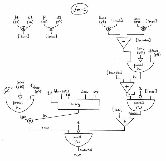 The FM-1 Class realizes a simple Frequency Modulation Synthesis with the following controls: