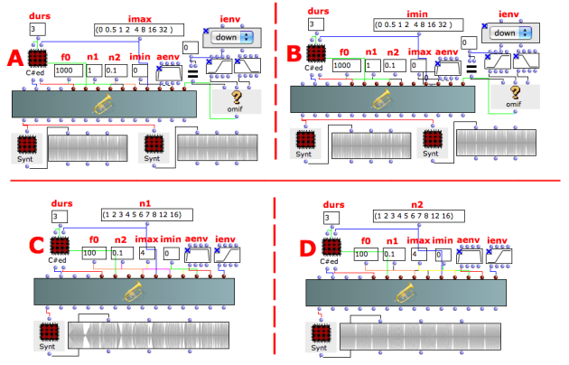 The example C focuses on the carrier multiplication factor (n1) with a steady sideband width (100*0.1=10 Hz). The sound begins rough and ends with a nice vibrato for the sake of the ratio between the modulating and the carrier frequency. At the beginning the sidebands are 10% away from the carrier i.e., M/C = ((f0*n2)/(f0*n1)) = n2/n1 = 0.1/1 = 0.1. At the end they are 0.625% away (0.1/16).