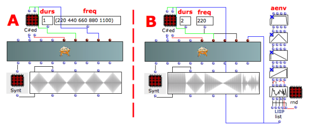 The example B deals with the amplitude envelopes made by 5 different BPF (Break Point Function).