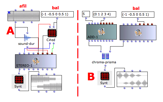 The example B shows how to use the generic function Chroma-Prisma to place a mono sound file in a stereo panorama from left to right.