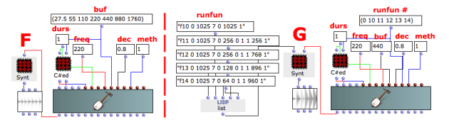 The example G gives 5 GEN subroutines as stored function used to initialize the cyclic decay buffer. The default one (f0) is random sequence, the kind of function (given as f- functions to the keyword inlets "tables" of synthesize) influence the timbre of the sound.