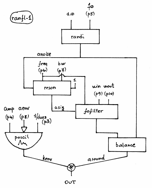 The RANFL-1 Class realizes a Random Amplitude Modulation of a Formant-Resonant Filter with the following controls: