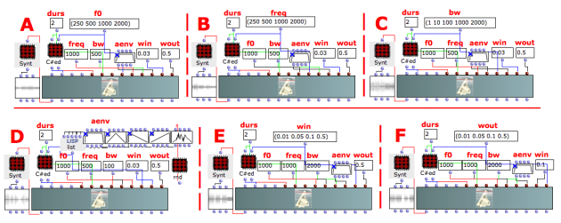 The example C spreads the bandwidth of the formant-resonant filter from 1 to 2000 Hz.
