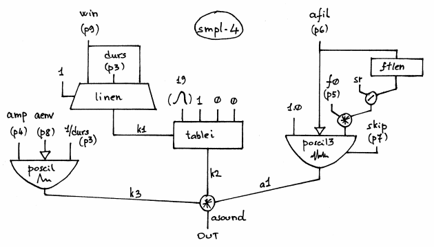 The SAMPL-3 and SMPL-4 use the GEN01 subroutine which transfers data from a soundfile into a function table, i.e. the audiophile is charged only once on the RAM.