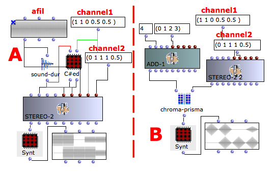 The example B shows how to use the generic function Chroma-Prisma to place a mono sound file in a stereo panorama with independent amplitude controls.