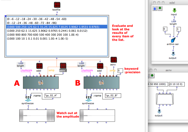 The box contains several lists of amplitudes . Select them one by one and evaluate the sound object.