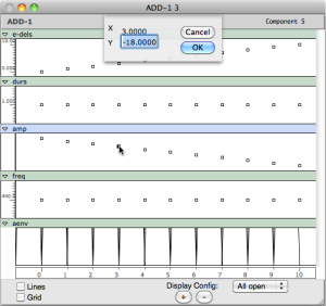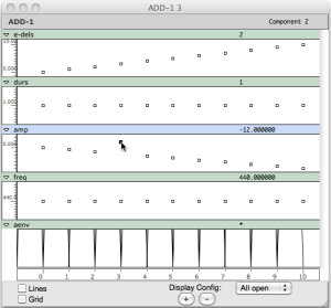 The function lisp-length returns the numbers of elements of the chosen list and passes the result to the slot numcols, which must always have the total amount of the components that need to be synthesized. In other words, numcols corresponds to the amount of columns of the matrix initialized by ADD-1 and in which the data are stored (see the internal editor below). It also corresponds to the amount of lines generated in the csound score for this event.