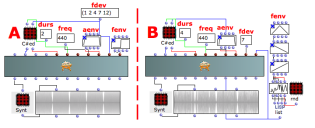 The example A brings about a little portamento between two frequencies with an interval of 1, 2, 4, 7, 12 semitones.