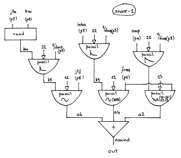 The SNARE-1 Class realizes a a simple simulation of a snare drum (percussion like sound) with the following controls:
