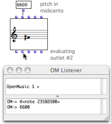 A note box has five inlets and outlets, a "self", and four other inlets, which correspond to the usual musical features or parameters of a note : midicents – pitch –, velocity – dynamics –, duration, midi channel.