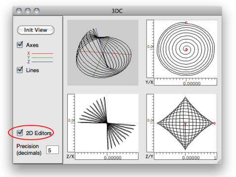 To display the three 2D editors corresponding to projections of the curves on the x/y, x/z and y/z planes, select the 2D Editors option. These editor are similar, and work exactly the same way as standard BPC editors.