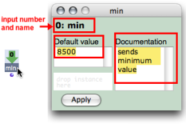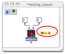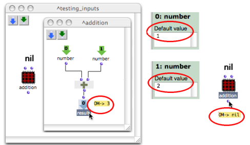 The inputs of an abstraction are represented inside the patch by green boxes. When these boxes are assigned default values , the patch can be evaluated internally and autonomously.